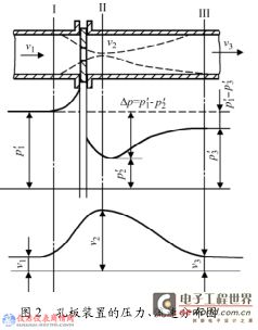 充滿管道的流體流經(jīng)管道內(nèi)的節(jié)流裝置,由于節(jié)流元件造成的流束局部收縮,使管中心流體流速發(fā)生變化,其靜壓力隨之變化。由于流體流經(jīng)孔板時(shí),產(chǎn)生局部渦流損耗和摩擦阻力損失,在流束充分恢復(fù)后,靜壓力不能恢復(fù)到原來(lái)的數(shù)值。節(jié)流元件前后的靜壓差大小與流量有關(guān),流量愈大,流束的收縮和動(dòng)、靜壓能的轉(zhuǎn)換也愈顯著,則產(chǎn)生的壓差也愈大。只要測(cè)得節(jié)流元件前后的靜壓差大小,即可確定流量,這就是節(jié)流裝置測(cè)量流量的基本原理,如圖2 所示。這種測(cè)量方法是以能量守恒定律和流動(dòng)連續(xù)性方程為基礎(chǔ)的。