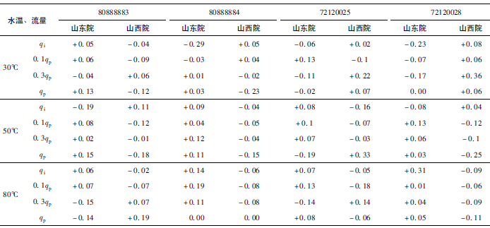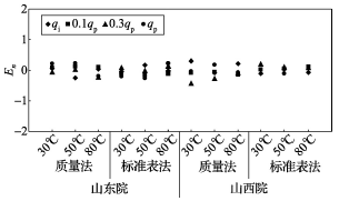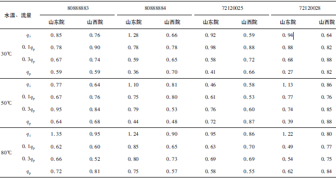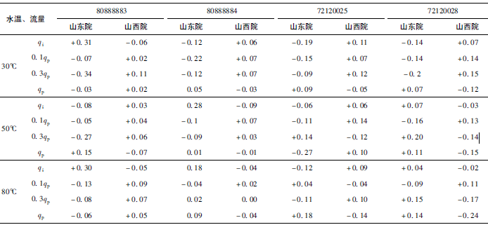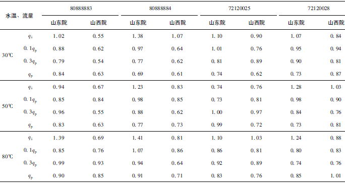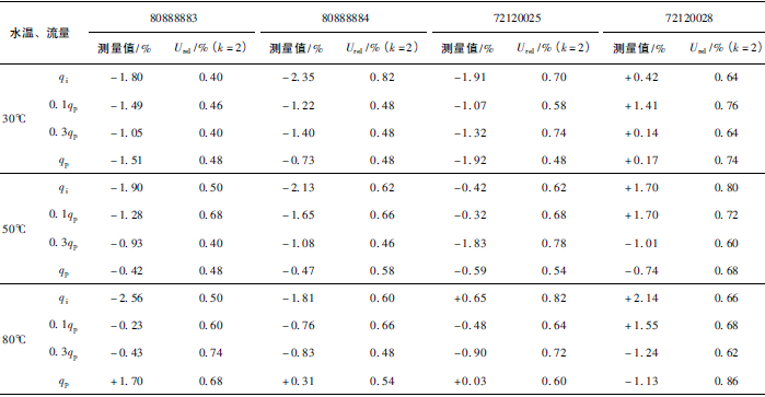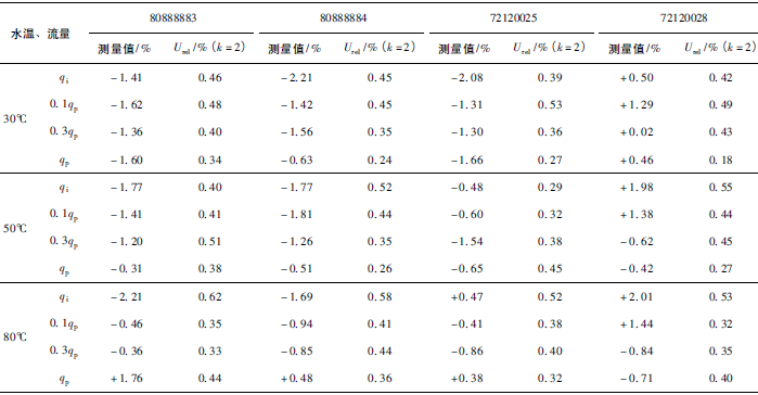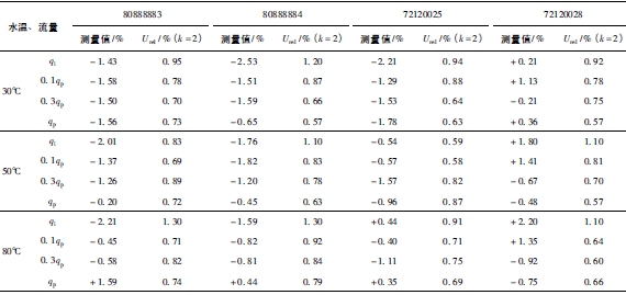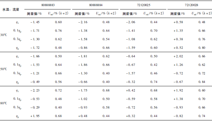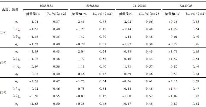 (2)累積體積(質(zhì)量法)相對示值誤差測量結(jié)果中,山東院在水溫80℃、qi點處與參考值的差值最大,為+0.31%(72120025);山西院在水溫30℃、0.3qp點處與參考值的差值最大,為+0.36%(72120028)。由于比對樣品在一些試驗點上的測量重復性不是很好,差值的擴展不確定度最大達到了1.35%。