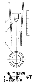 金屬轉(zhuǎn)子流量計的流量檢測元件是由一根自下向上擴大的垂直錐形管和一個沿著錐管軸上下移動的浮子組所組成。工作原理如圖1所示,被測流體從下向上經(jīng)過錐管1和浮子2形成的環(huán)隙3時,浮子上下端產(chǎn)生差壓形成浮子上升的力,當(dāng)浮子所受上升力大于浸在流體中浮子重量時,浮子便上升,環(huán)隙面積隨之增大,環(huán)隙處流體流速立即下降,浮子上下端差壓降低,作用于浮子的上升力亦隨著減少,直到上升力等于浸在流體中浮子重量時,浮子便穩(wěn)定在某一高度。浮子在錐管中高度和通過的流量有對應(yīng)關(guān)系。