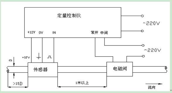 2、定量值設定完后,按下啟動按鈕電磁閥、水泵打開,流量計開始工作。儀表右邊窗口開始根據左邊定量值累加,等達到定量值后電磁閥、水泵自動關閉,定量結束。